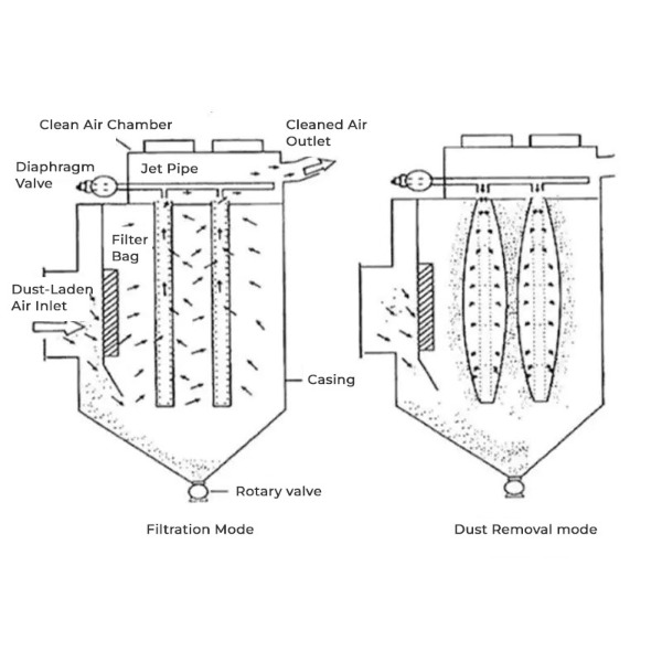 Zberač prachu vreckového filtra funguje tak, že pretláča vzduch alebo plyn cez filtračné vrecká, ktoré zachytávajú prachové častice. Vyčistený vzduch prechádza cez vrecká, zatiaľ čo prach sa hromadí na vonkajšej strane tkaniny, ktorá sa periodicky čistí pomocou stlačeného vzduchu.